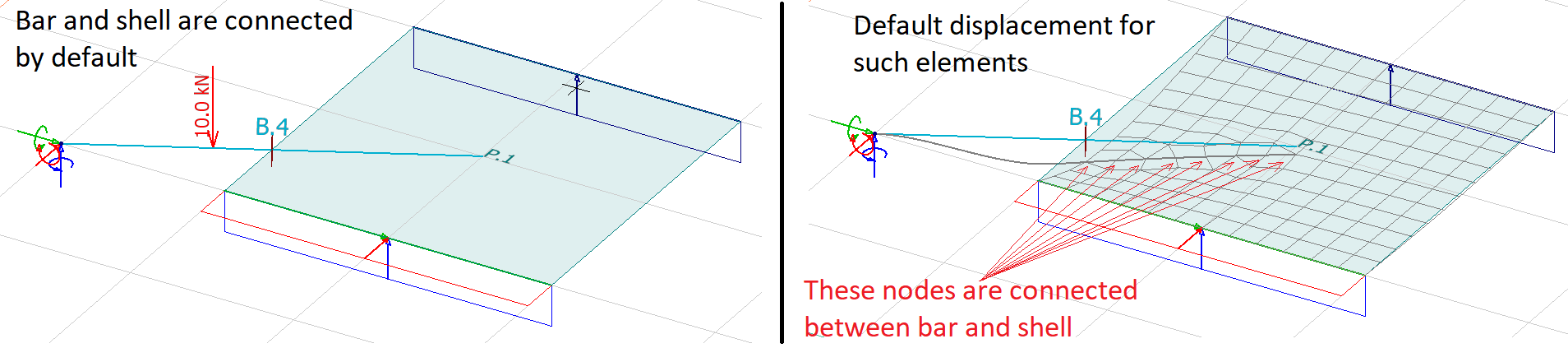 Similar operation is possible for bars that are connected to shell elements (plates and walls). For example, in figure 6 there is a bar and a shell with their default behavior. By default, the bar will be connected to the shell with every point they have in common (all finite element nodes along bar).