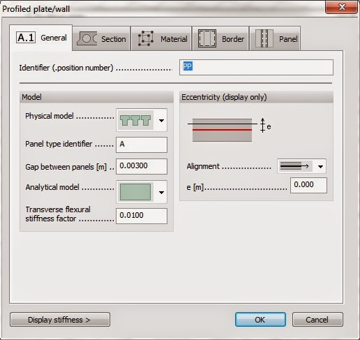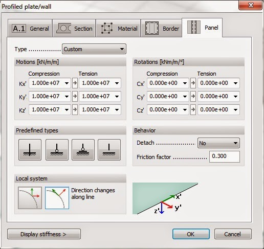 The settings in this tab are the boundary conditions between each of the panels. If they are not connected in the vertical direction to each other, but want them to transfer forces in the horizontal plane, then set Kz' to zero. This would simulate a hollow core floor without grouting, or a thin steel sheeting without a rivet-connection. In the finished structure a connection between these objects are usually common practice so in that case, use the Hinged button to connect the panels internally with a hinge connection.