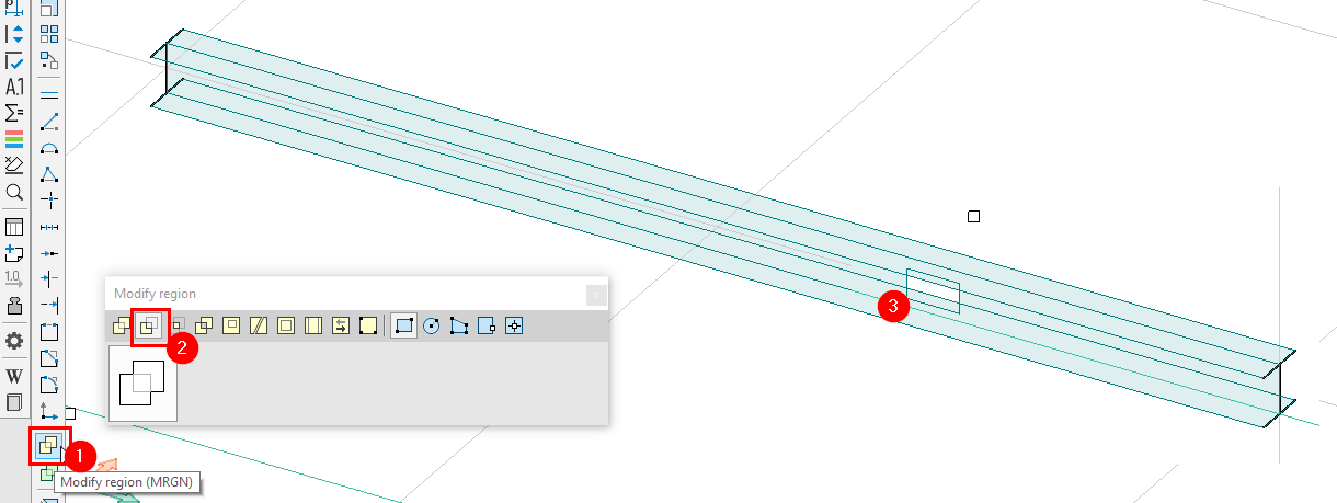 Vi kan göra hål i skalmodellen som vi skulle göra i alla andra skalelement. Det enklaste sättet är att använda verktygen i "Modify region". Nedan är en bild som visar hur man kan skära ett hål i balkens liv till exempel: