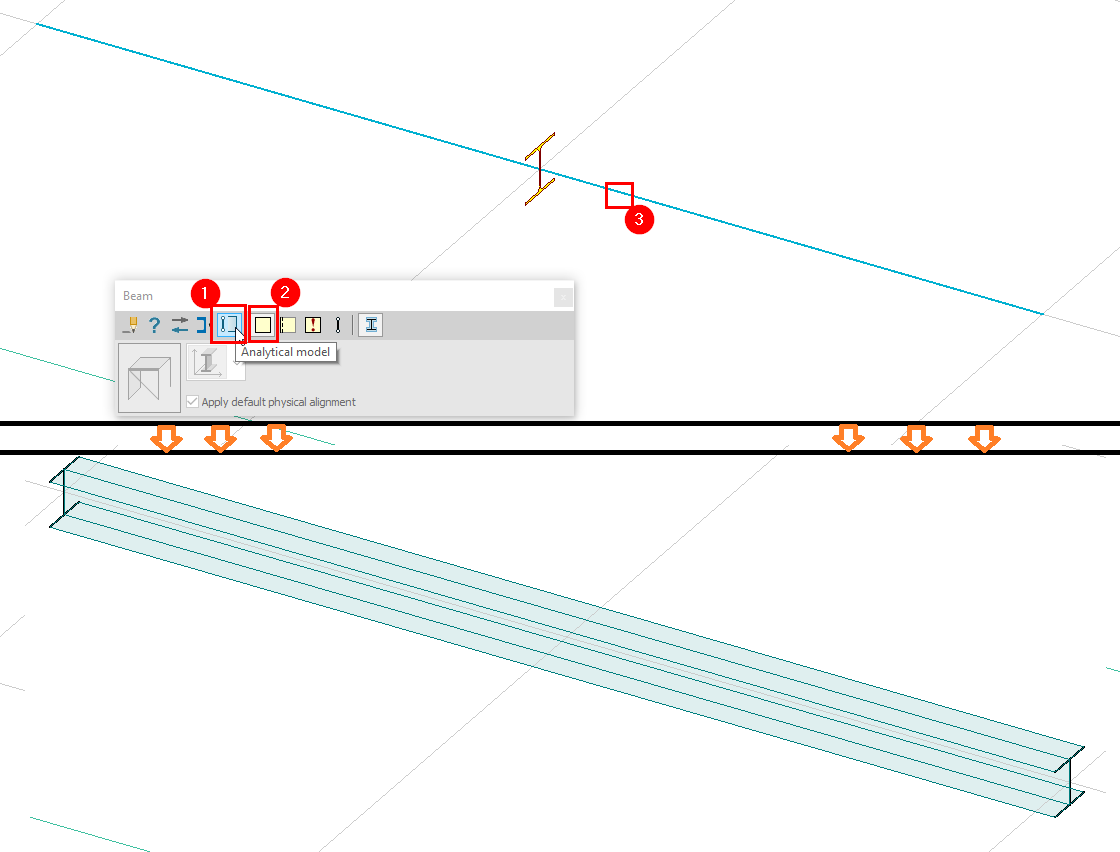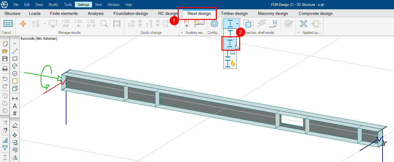 Välj sedan verktyget "Analytical model" från balkverktygsfältet (nummer 1 i figur 1) och använd alternativet "Shell model" bredvid (nummer 2 i figur 1). Nu måste vi välja balken vi vill konvertera och högerklicka på den. FEM-Design kommer att konvertera balken till en serie skalelement som representerar den ursprungliga formen. Vi hade alternativet “Generate fictitious bars to the boundary of shell model” aktiverat, så vi fick fiktiva stänger i båda ändar av balken. Dessa kommer att garantera kontinuerlig anslutning till andra objekt som punktstöd och punktlaster.