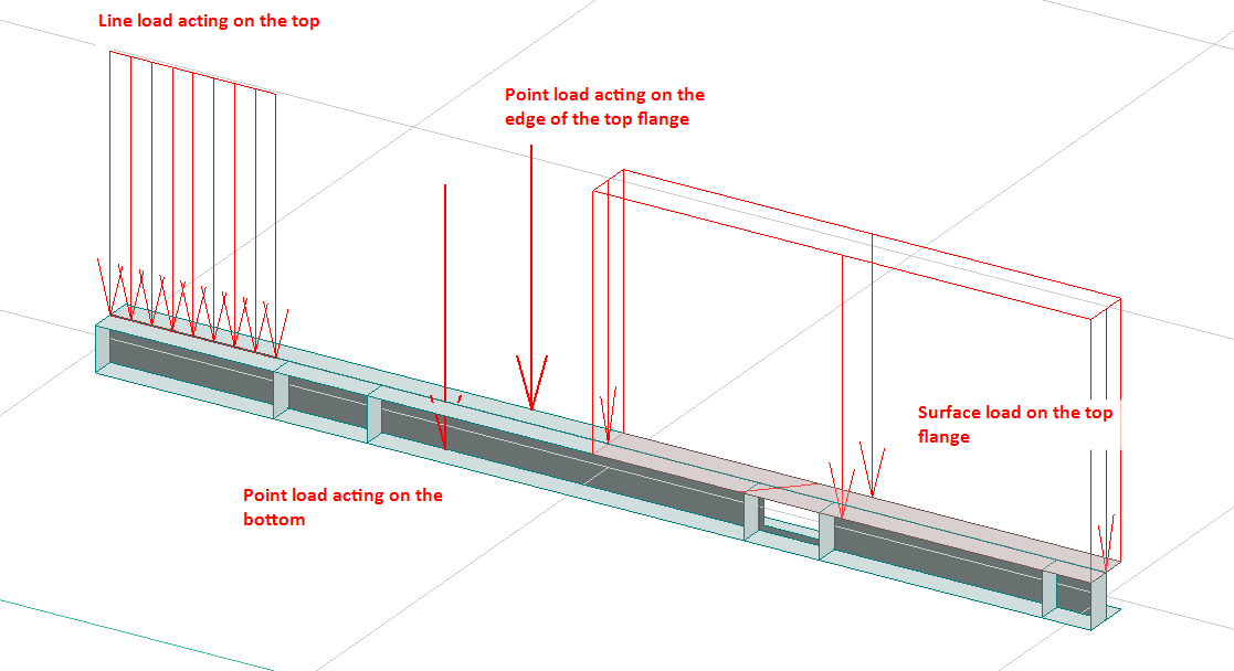 Laster kan appliceras på skalmodellen som linje- eller punktlast (som vi skulle göra för en vanlig balkmodell), men vi kan välja var belastningen verkar – om det är den övre eller nedre flänsen. Lasten kan också appliceras som en ytast för att simulera den likformiga belastningen på den övre flänsen till exempel.