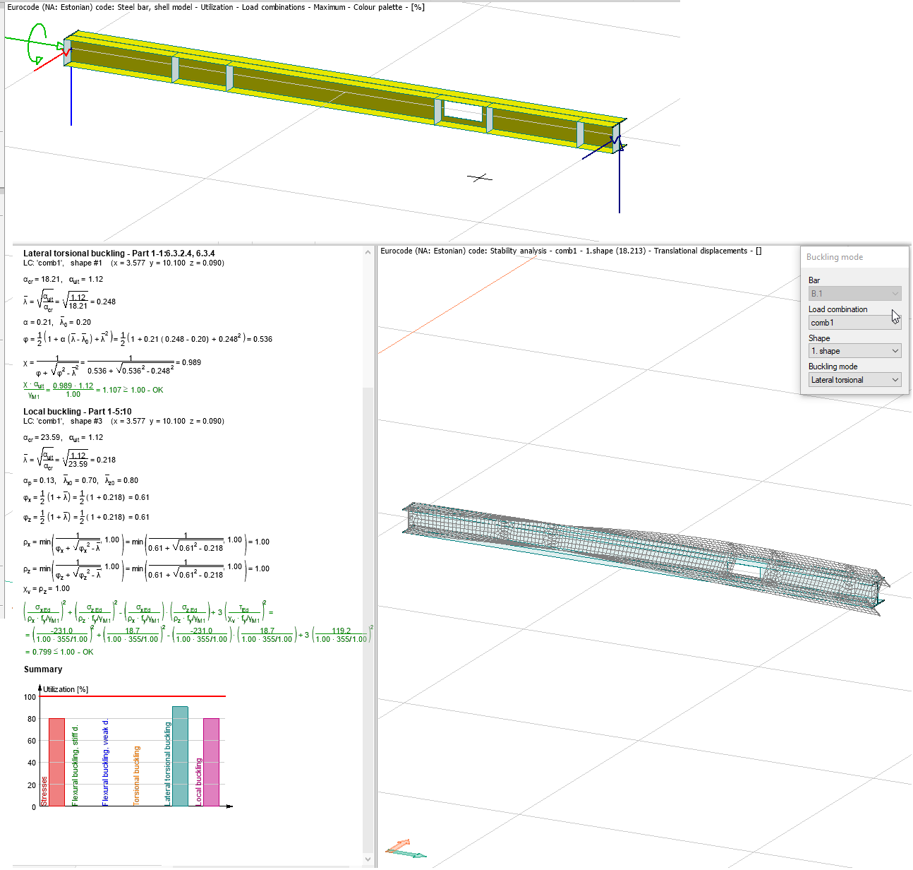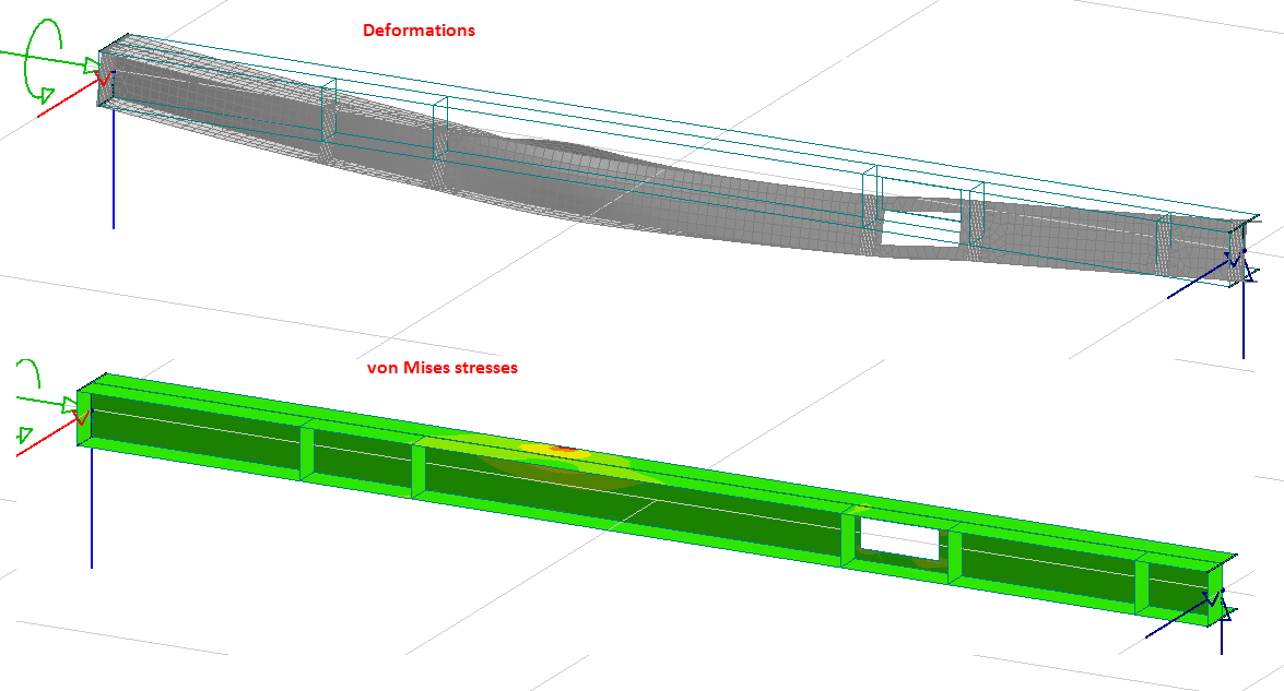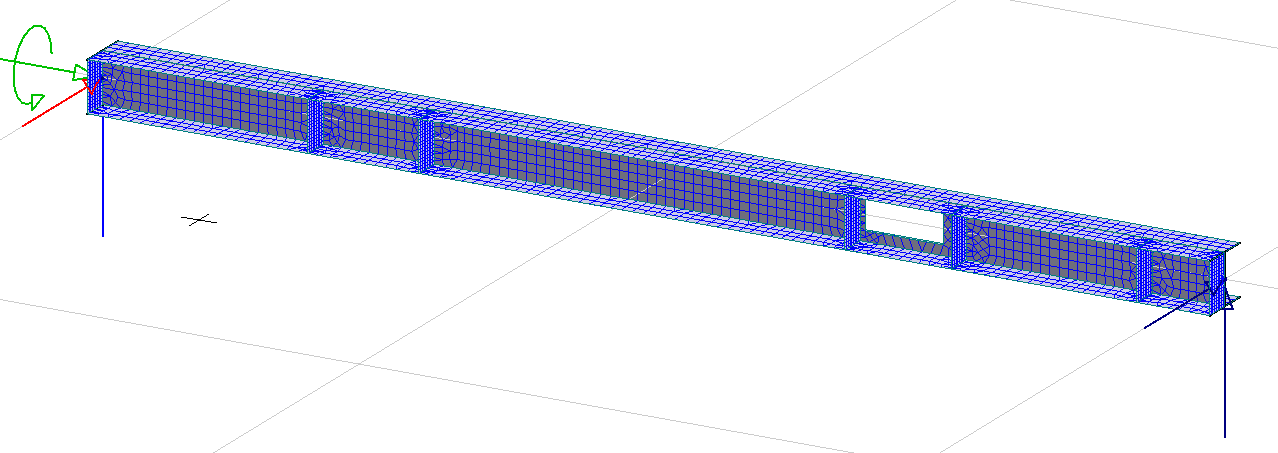 Den här typen av skalmodell ger oss bättre noggrannhet i vissa situationer – speciellt för stabilitet i delar av balken och utnyttjandegradskontroller för böjning eller vippning. Dessutom tillåter det vissa specialfall som inte är möjliga med en vanlig balkmodell: främst modellering av hål och lokala förstyvningar.
